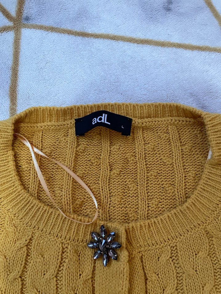 Sarı renkli, nakış detaylı, yuvarlak yaka ve uzun kollu bohem tarzda triko kadın kazak. Rahat ve bol kesim, günlük kullanıma uygun.