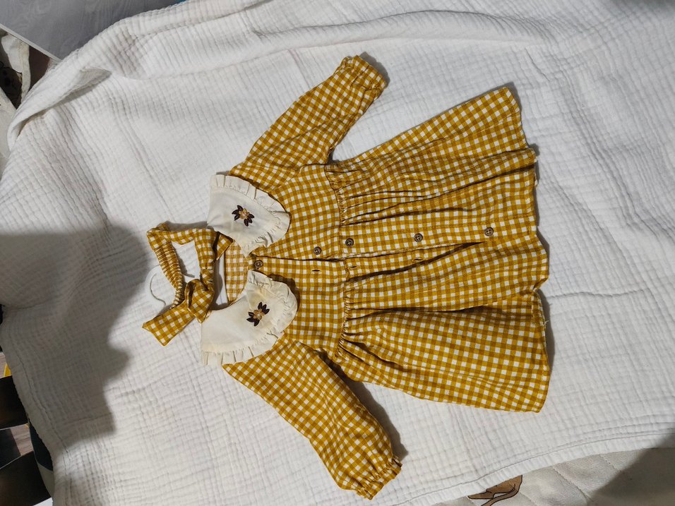 Sarı kareli, uzun kollu, düğmeli ve nakış işlemeli bohem tarzda, bol kesim kız elbisesi.
