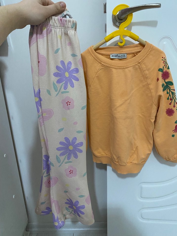 Kızlar için, sarı nakışlı, uzun kollu sweatshirt ve çiçek desenli pastel pantolonlu bohem tarzı eşofman takımı. ✨