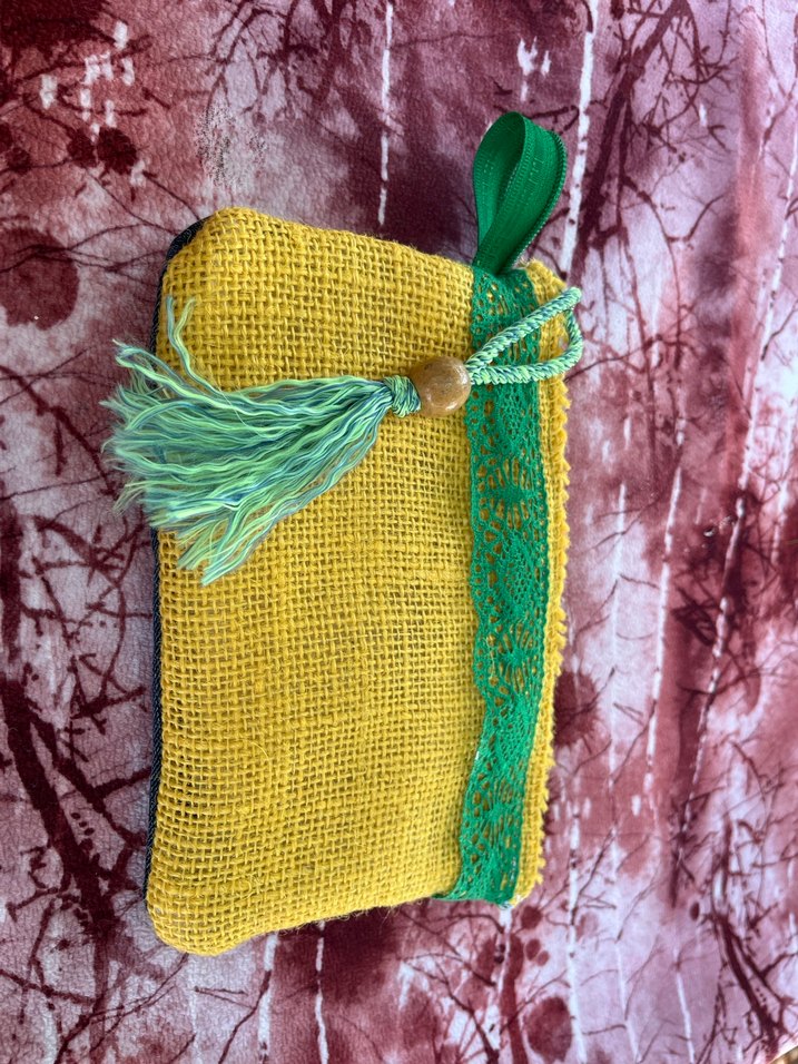 Sarı renkli sentetik kumaştan, nakışlı ve yeşil püsküllü detaylara sahip bohem tarzda kadın clutch çanta. Günlük kullanıma uygundur.