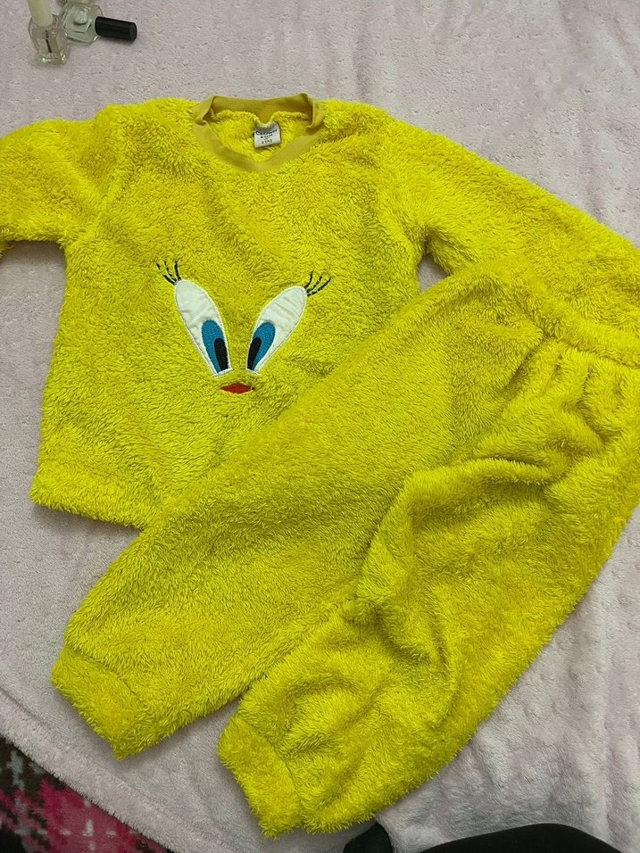 Yumuşak ve sıcak kumaştan yapılmış, sarı renkli çocuk uyku takımı. Üstünde renkli nakış gözler bulunur. Rahat ve konforlu. 3 yaş için uygundur