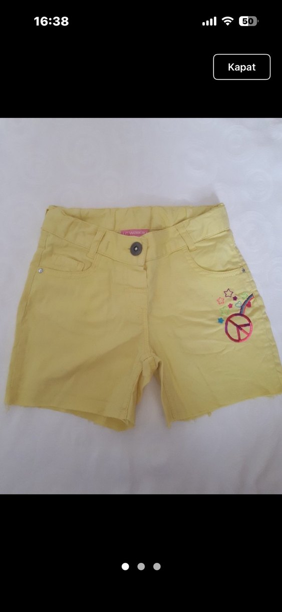 Sarı renkli, düğmeli kız şortu, nakışlı renkli desenlere sahip, bol kesim ve bohem, hippie tarzına uygun.