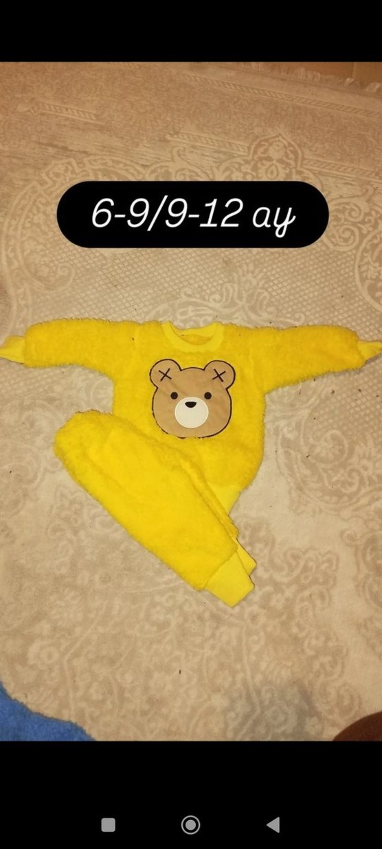 Sarı renkli, uzun kollu, bisiklet yaka ve nakışlı ayıcık desenli erkek bebek takımı. Yumuşak ve sıcak örgü kumaştan, 6-12 ay arası uyumlu.