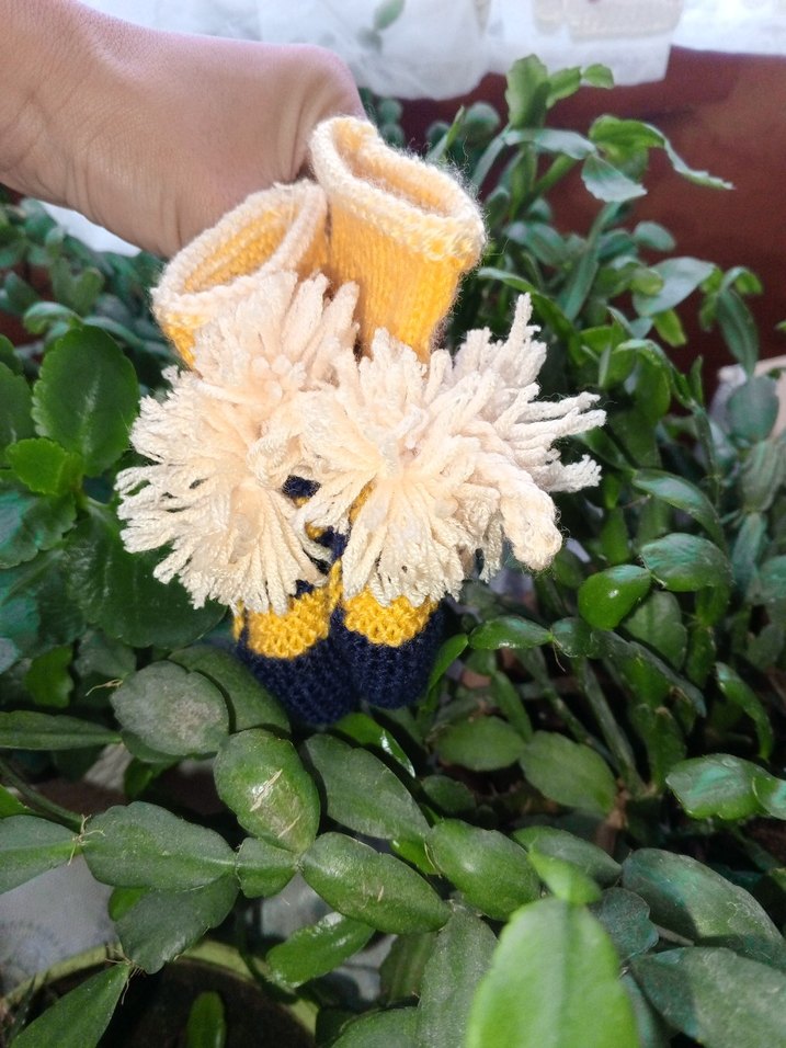 Renkli nakışlı, sarı örme erkek çocuk patigi Yumuşak örgü kumaş ve bohem tarzıyla dikkat çekici detaylar içerir.