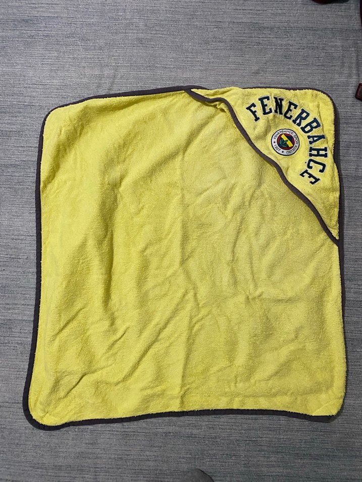 Yumuşak kumaştan, gri kenarlıklı, Fenerbahçe nakışlı sarı havlu.