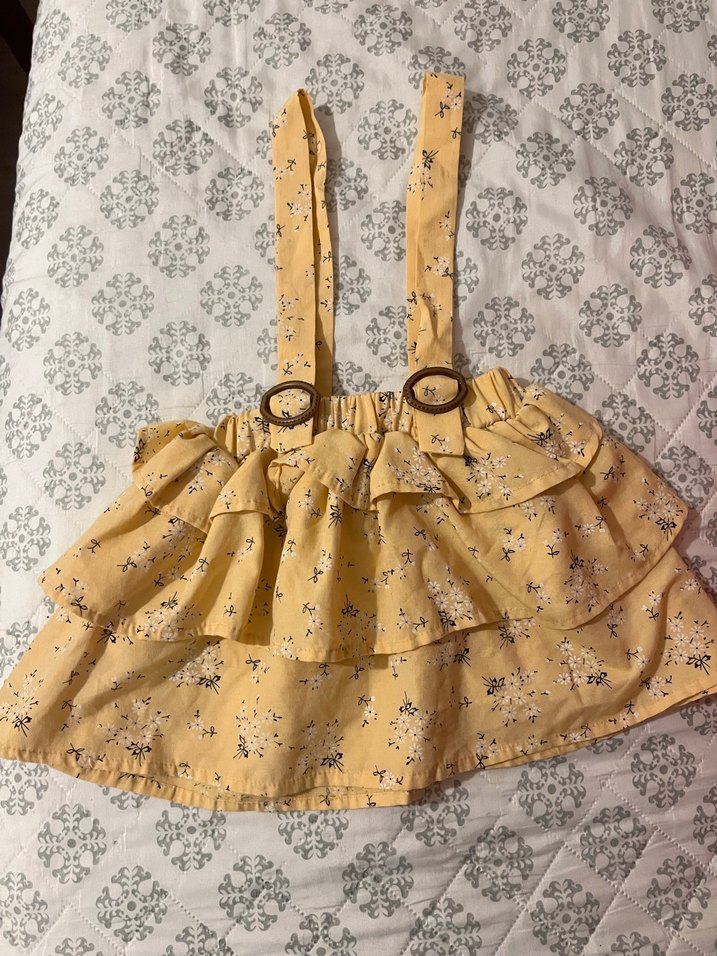 Nakışlı desenlere sahip, fırfırlı ve askılı sarı renkli bol kesim elbise. Yumuşak sentetik kumaştan yapılmıştır, bohem tarzda.