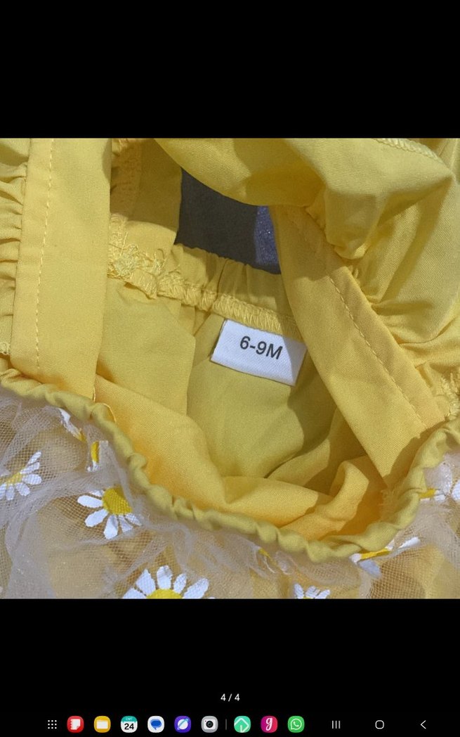 Pastel sarı renkli, kısa kollu, tekne yaka, bol kesim kız elbisesi. Nakışlı fırfır detaylarıyla sokak stiline uygun. 6-9 ay beden.