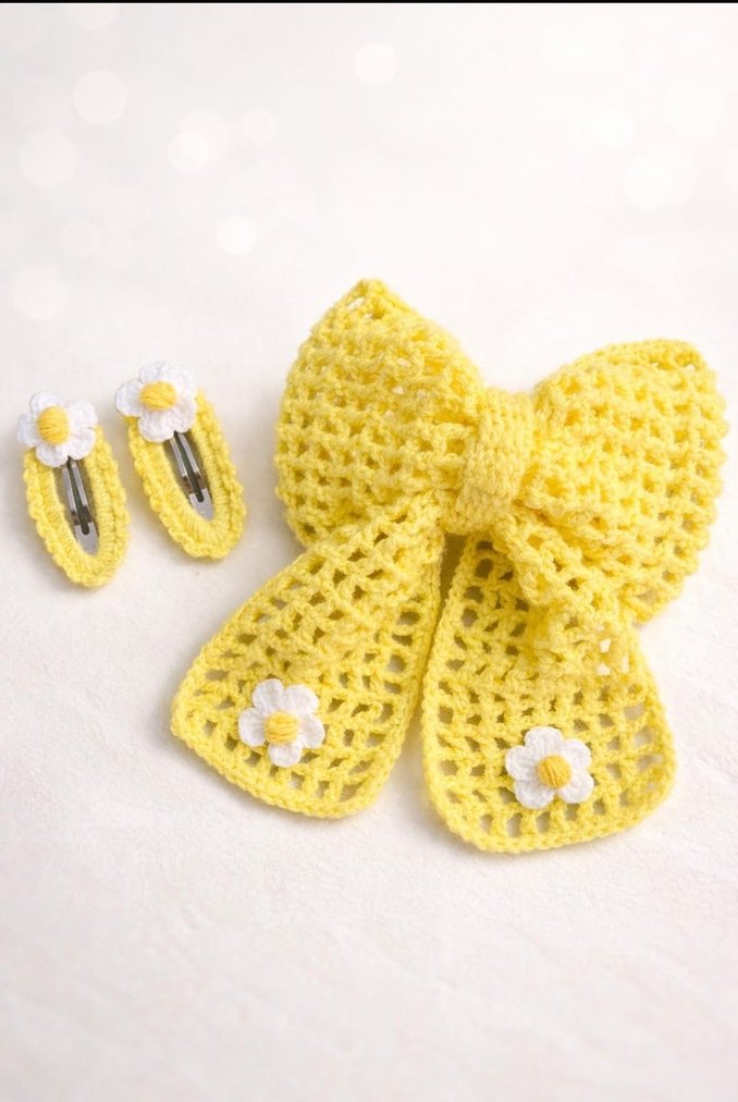 Bohem tarzda, sarı tığ işi fiyonk ve üzerinde nakışlı beyaz çiçek detaylı çocuk saç tokası seti.