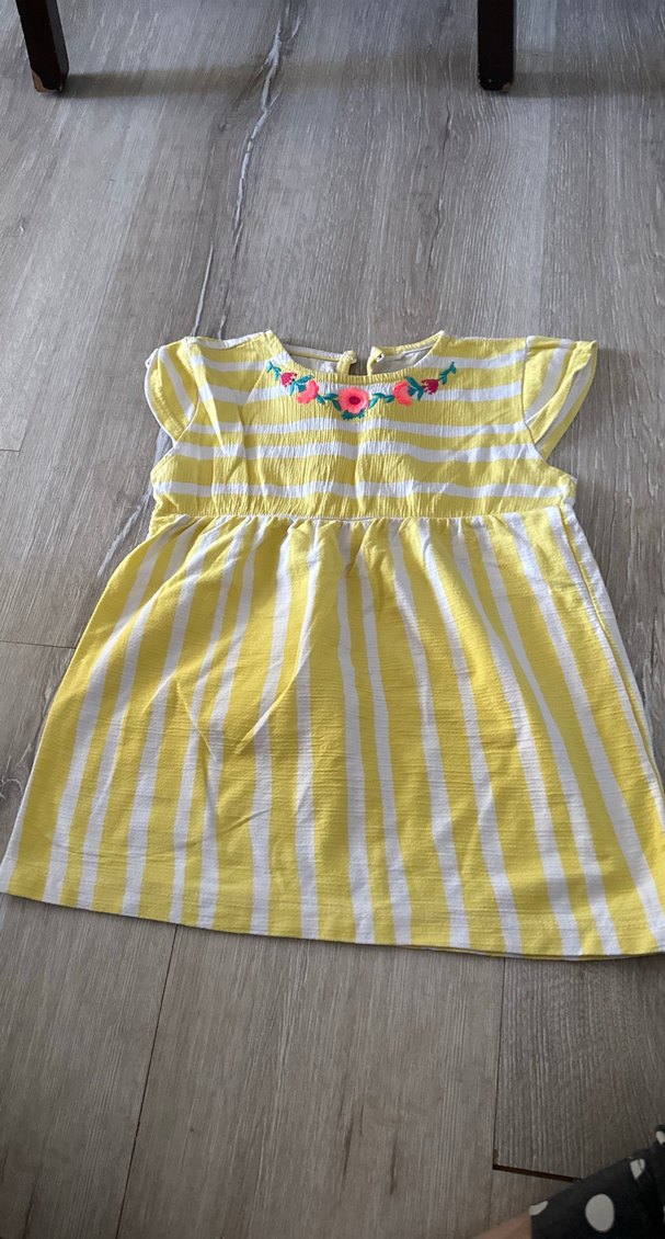 Kısa fırfırlı kollu, tekne yaka, renkli çiçek nakışlı sarı çizgili rahat kesim kız çocuk elbisesi. Yumuşak dokulu kumaştan, bohem tarzda.