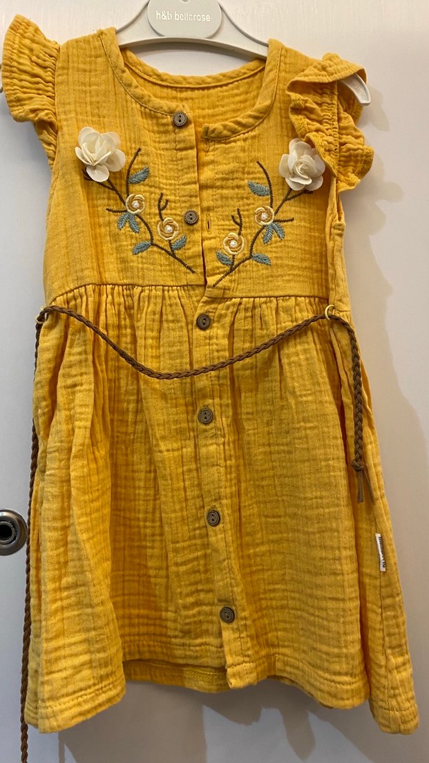 Sarı keten kumaştan, düğmeli, nakışlı çiçek detaylı, askılı kollu ve örgü kemerli bohem tarzda kız çocuk elbisesi.