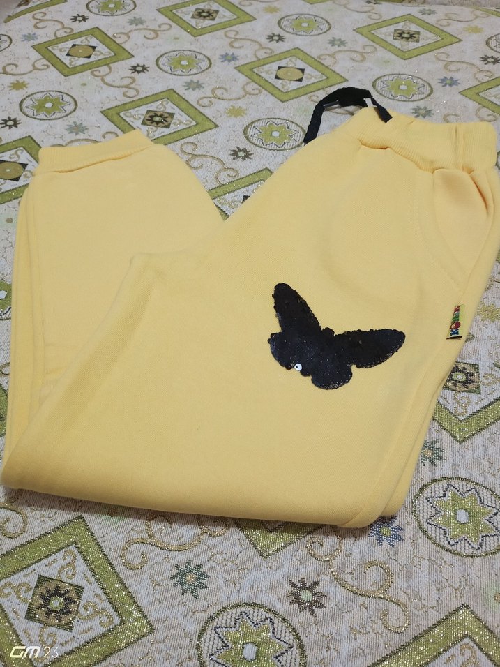 Yumuşak ve sıcak kumaştan yapılmış, bol kesim sarı kız eşofman Nakışlı kelebek detayı ve fermuarlı cepler bulunur.