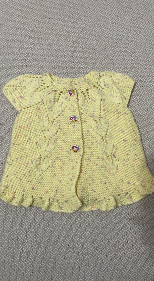 Sarı renkli, nakış detaylı örgü kız hırka, kısa kollu ve bol kesimdir. Bohem tarzı ve pastel tonlarıyla dikkat çeker. 6ay-1yaş