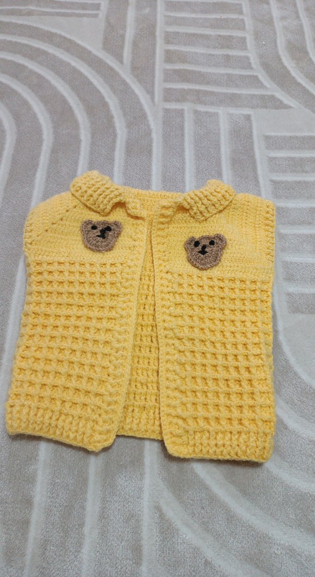 Sarı renkli, uzun kollu, nakışlı ayı desenli örgü kız hırkası. Normal kesim ve normcore tarzında tasarlanmıştır.