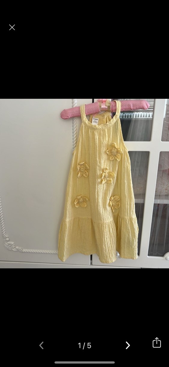 Soluk sarı keten kumaştan yapılmış, nakışlı çiçek detaylı, kolsuz ve salaş kesim kız elbisesi, fırfır detayları bulunur.
