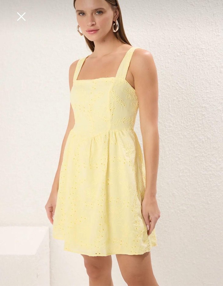 Sarı nakışlı dantel detaylı, askısız, kolsuz, normal boy midi elbise, yumuşak sentetik kumaştan, romantik akşamlar için uygundur.