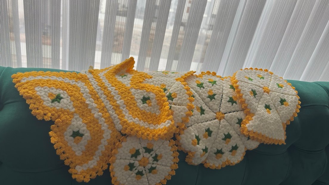 Nakışlı desenlere sahip renkli sarı örgü lifidir , yumuşak ve konforlu dokuya sahiptir.