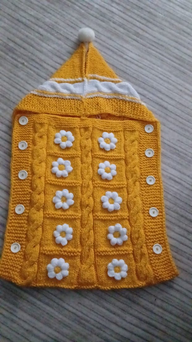 Sarı örgü bebek battaniyesi, renkli nakışlı çiçek desenleri ve ayarlanabilir yan düğmelerle. Çocuklar için yumuşak ve rahat. kundak battaniye her türlü model ve renk sipariş kabul edilir fiyat doğru değildir