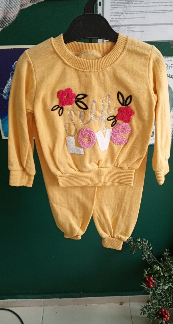 Uzun kollu, sarı örgü bebek kız takımı, renkli nakışlarla süslenmiş çiçek ve "LOVE" yazısı bulunur. 4 yaş 5 ,6, 7 yaş mevcuttur