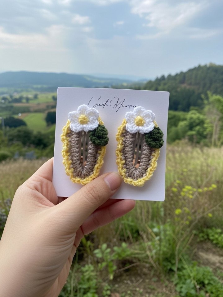 Nakışlı beyaz çiçekler ve yeşil yapraklarla süslenmiş, pastel sarı kenarlı örgü çocuk tokası, bohem tarzda.