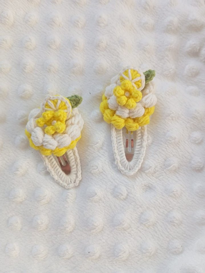Sarı renkli, nakışlı ve örgü çiçek desenli çocuk saç tokaları, bohem tarz için uygundur.