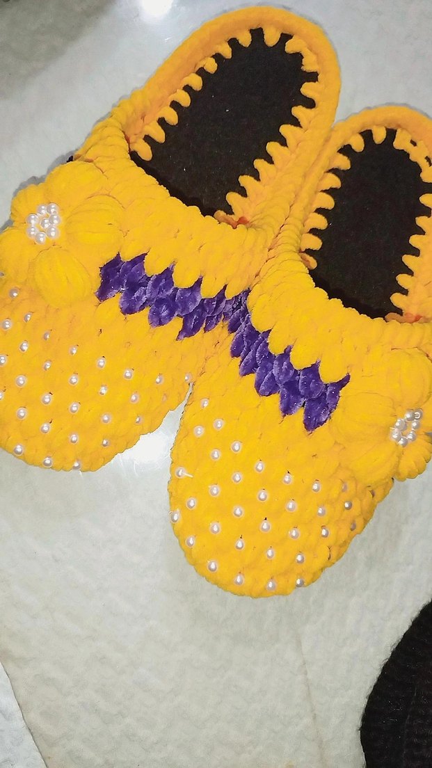 Sarı renkli, nakışlı ve inci detaylı örgü kadın terlik. Rahat ve renkli tasarımı ile günlük kullanıma uygundur.