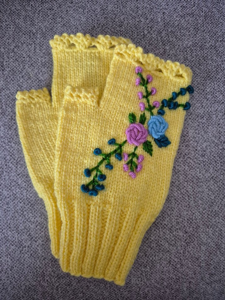 Sarı örgü parmaksız eldivenler, renkli çiçek nakışıyla bohem ve rahat bir tarz sunar. Retro ve hippie görünüme uygundur.
