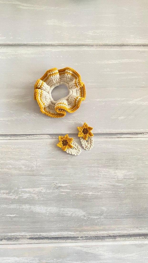 Bohem tarzda, sarı tonlarında örgü scrunchie ve nakışlı çiçek saç tokalarından oluşan set. Anne bebek uyumlu set halinde