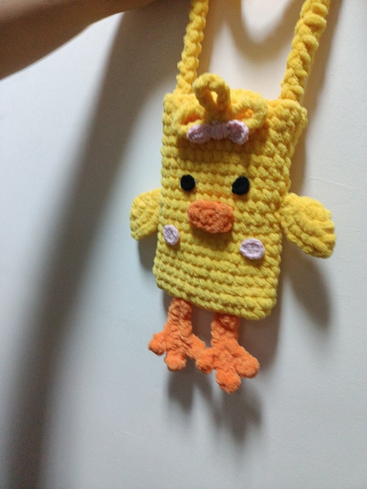 Renkli sarı örme bebek önlüğü, nakışlı civciv figürü ve kolay takma için örülmüş askılar içerir.