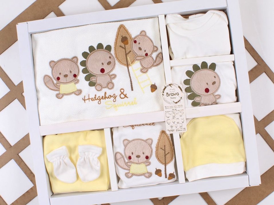 Nakışlı kirpi ve sincap desenleriyle süslenmiş, sarı pamuklu bebek uyku seti, rahatlık ve şıklık sunar.