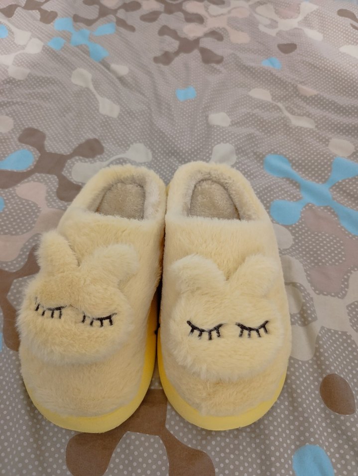 Yumuşak sarı kürk detaylı, nakışlı kapalı göz desenli, düz tabanlı kadın ev terliği.