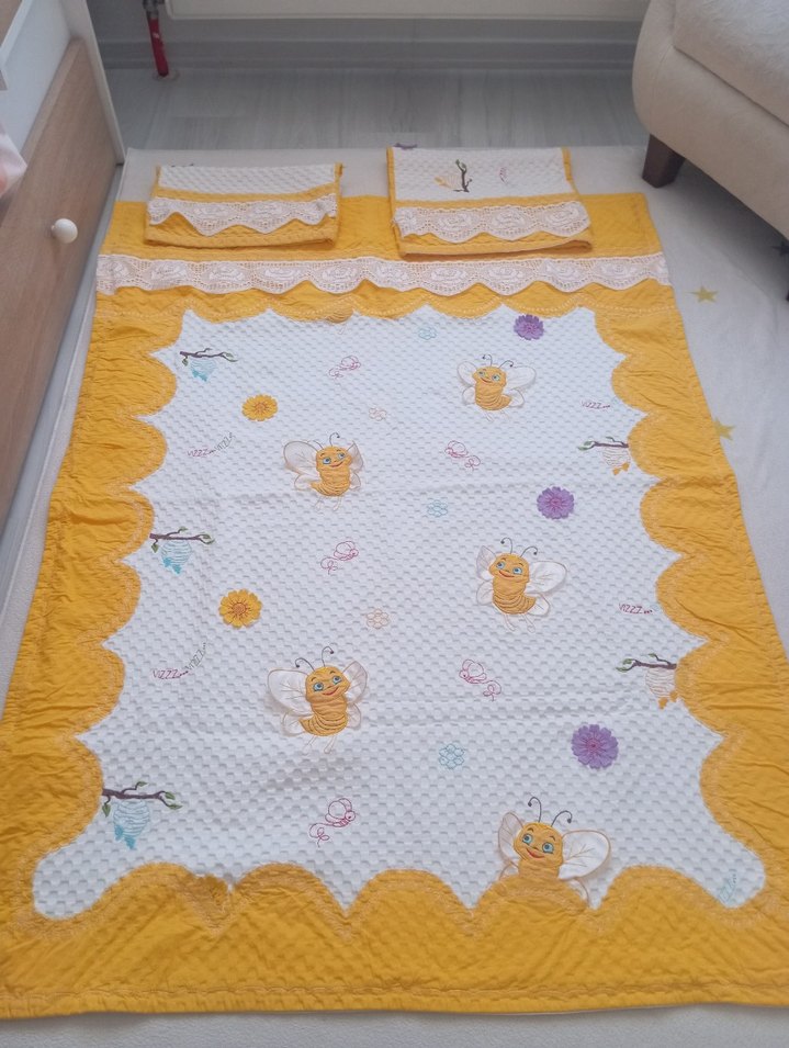 Bu yatak örtüsü, sarı kenarlıklı, renkli nakışlı arı desenleriyle dikkat çeker. İnce dantel detaylı uyumlu yastık kılıfları dahildir.