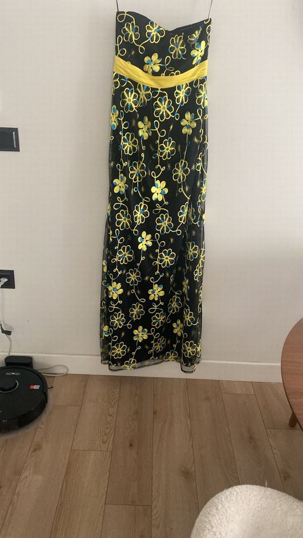 Sarı renkte, nakışlı çiçek desenleriyle süslenmiş, straplez yakalı ve bol kesim uzun elbisedir. Kumaşı sentetik ve bohem tarzı yansıtır.