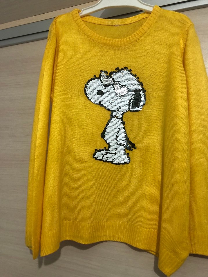 Sarı renkli, yuvarlak yakalı ve uzun kollu triko kazak. Nakışlı Snoopy figürüyle süslenmiş, rahat kesim ve günlük rahat sokak stili için uygun.
