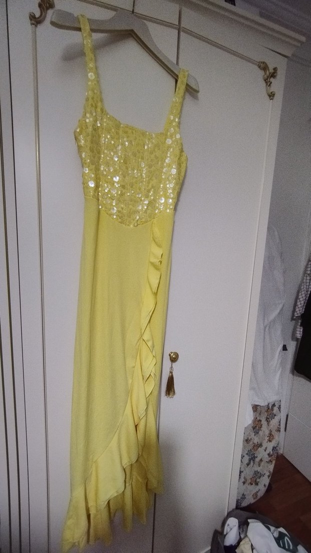 Sarı Nakışlı Uzun Abiye Elbise