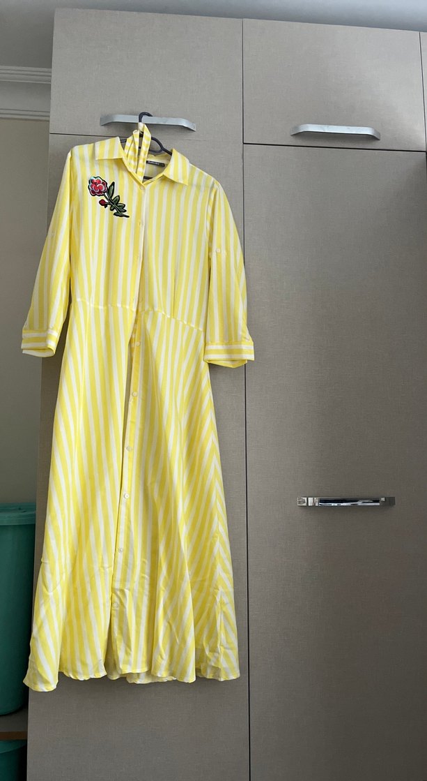 Sarı uzun elbise, yakalı ve düğmeli ön kısmıyla dikkat çeker. Nakış detaylı, uzun kollu ve rahat kesimdir. Yumuşak sentetik kumaştan, günlük kullanım için uygundur.