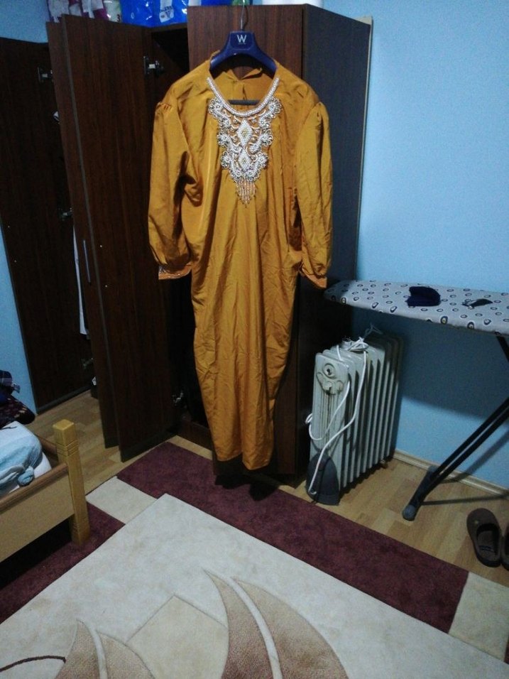 Uzun kollu, yuvarlak yakalı sarı elbise, nakış detaylı ve drapeli ipeksi kumaştan. Bol kesim ve parlak görünümlü, bohem tarz için uygun.