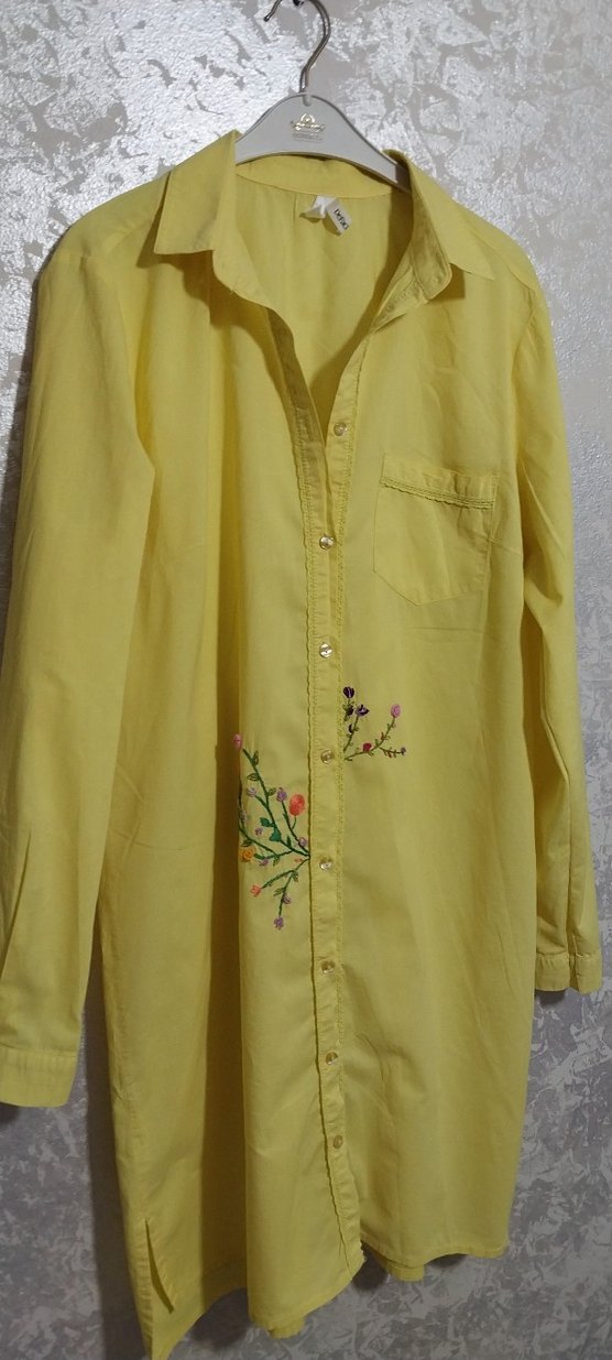 Düğmeli, notalı yakalı, uzun kollu, bol kesim sarı tekstil gömlek, nakışlı çiçek desenleriyle tamamlanmıştır.