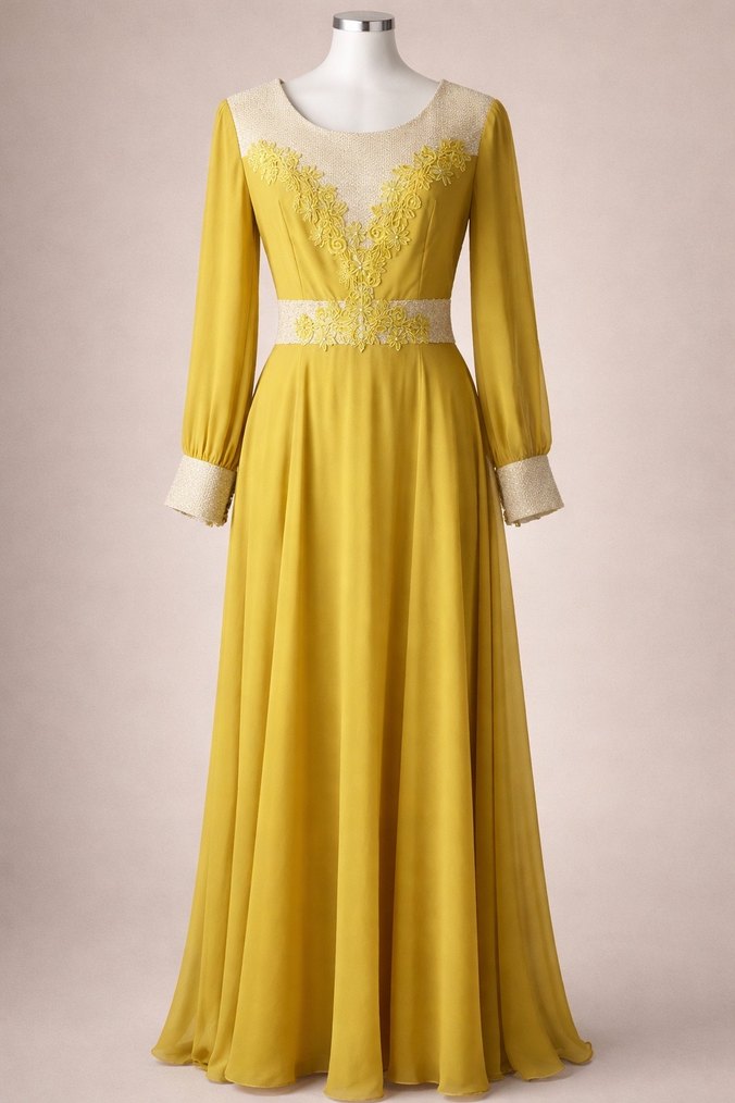Pastel sarı renkte, uzun kollu ve kayık yaka kadın abiye elbise. Nakışlı detaylara sahip, bol ve dökümlü kesimiyle vintage ve modern klasik tarzı birleştirir.