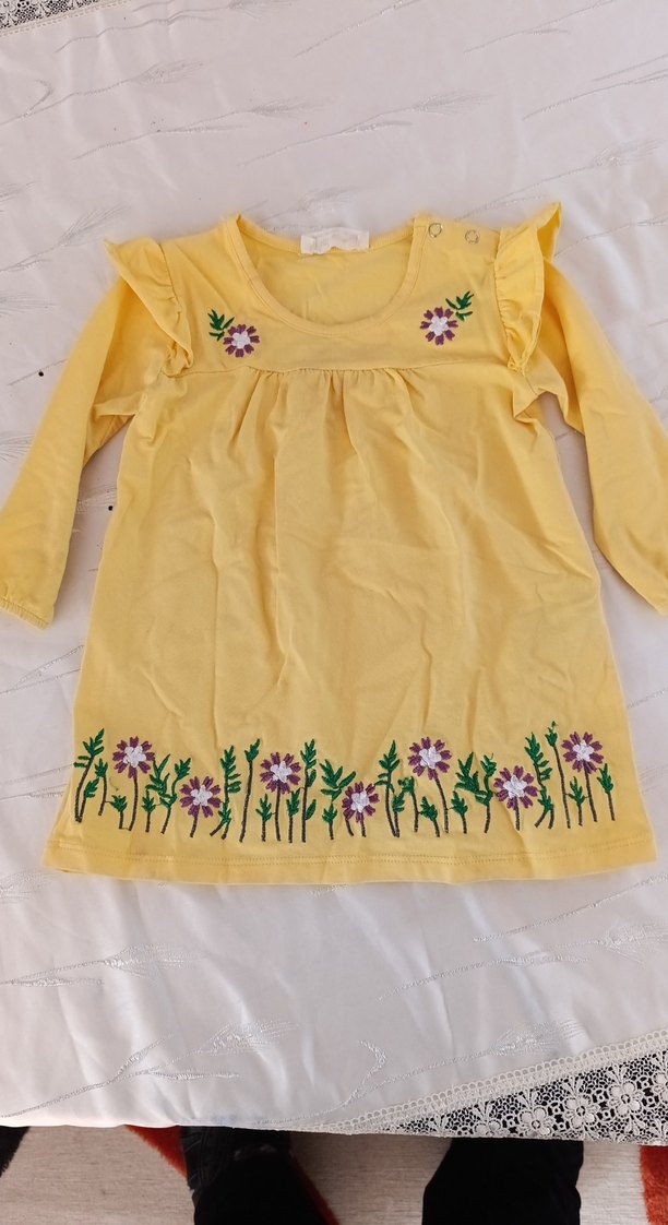 Sarı renkli, uzun kollu kız elbisesi, renkli çiçek nakışları ve fırfır detaylara sahiptir. Yumuşak sentetik kumaştan, salaş kesim ve yuvarlak yaka ile.