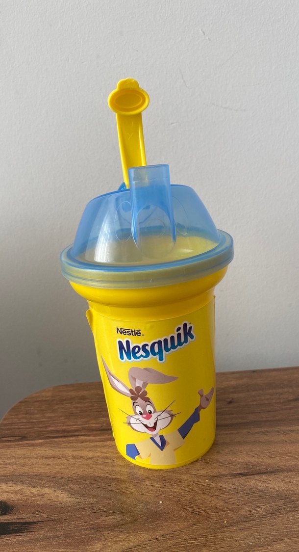 Sarı renkli, pastel tonlu Nesquik bebek biberonu, kolay kullanım için açılır kapaklıdır. Nestle markalıdır. 3 kere kullanıldı
