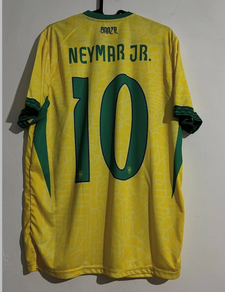 Sarı renkli, Neymar Jr. ve Brezilya baskılı, sentetik kumaşlı, kısa kollu, bol kesim erkek spor tişörtü. Rahat ve drapeli tarzda, sportif sokak giyimi için uygundur. ⚽
