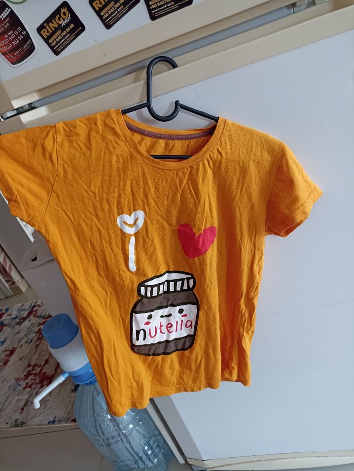 M beden. yakasinda küçük kusur var. Rahat kesim, kısa kollu, yuvarlak yaka, sarı pamuk tişört. Üzerinde renkli Nutella kavanozu baskısı bulunur.