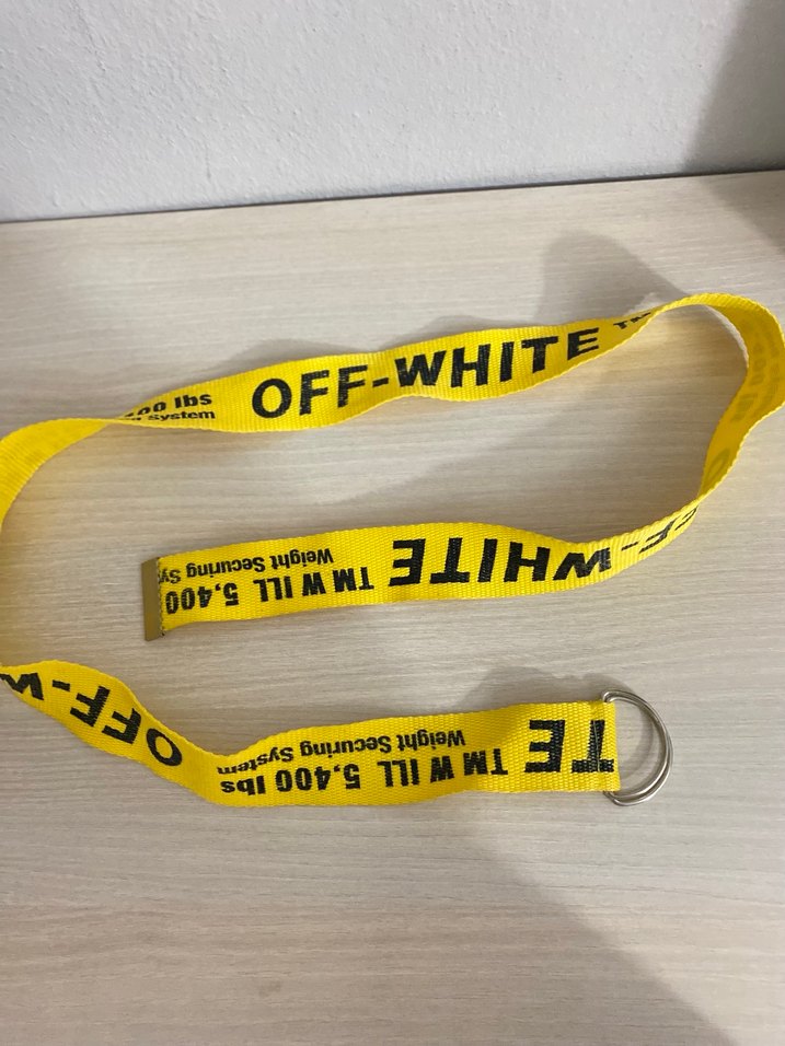 Sarı renkli, plastik banttan yapılmış OFF-WHITE baskılı sokak stili kadın kemeri. D halka kapamalı, renkli athleisure tarzlar için uygun.