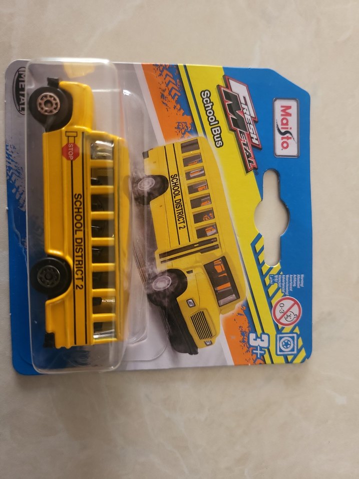 Bu sarı Maisto oyuncak araba, detaylı pencereleri ve tekerlekleri olan okul otobüsü şeklindedir. Yanında 'School District 2' ve dur işareti bulunur.