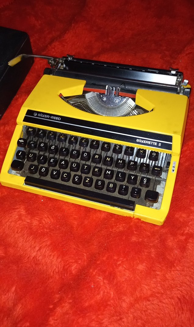 Sarı renkte, siyah tuşlara sahip Olivetti-REED daktilo, renkli ve kompakt tasarımıyla nostaljik bir yazım deneyimi sunar. ⌨️
