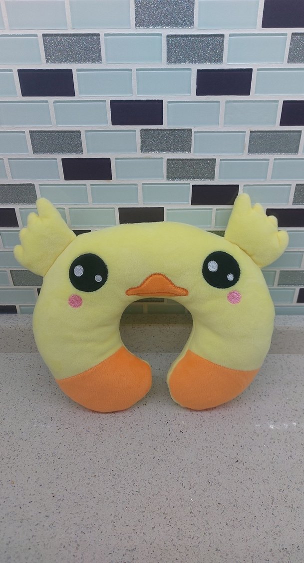 Yumuşak sarı peluş malzemeden yapılmış, büyük gözlü ve turuncu gagalı sevimli ördek şeklinde boyun yastığı. Rahat ve renkli, seyahat için uygun.