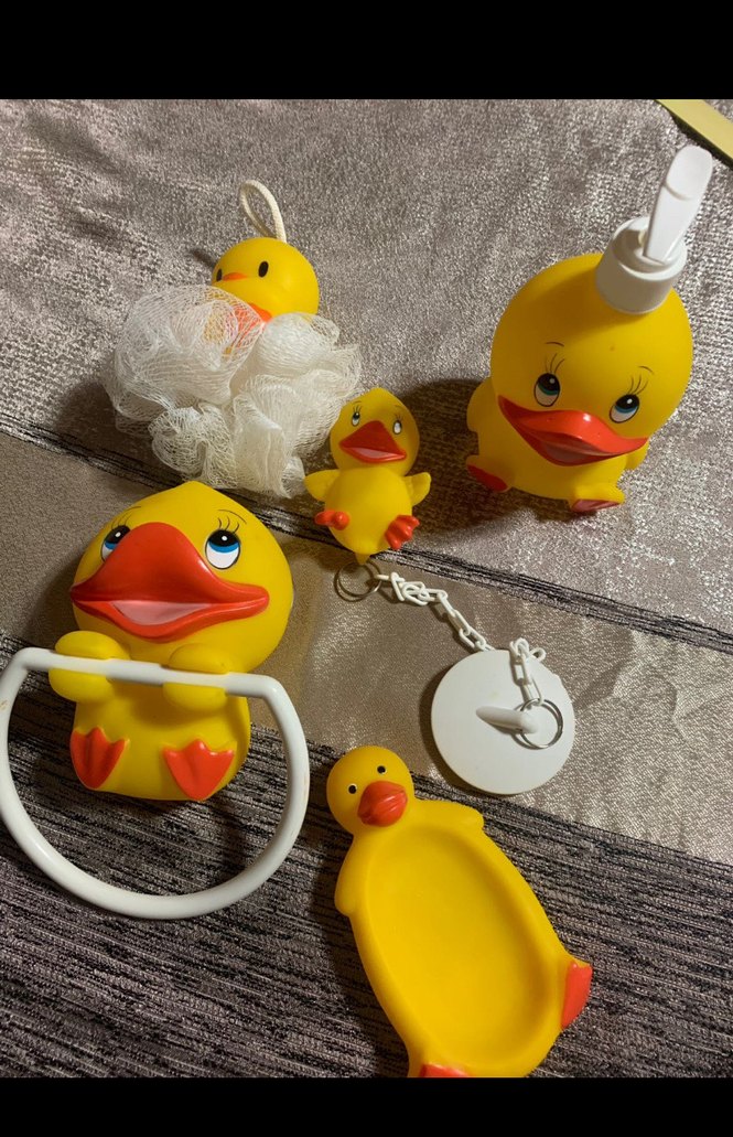 Sarı renkli, ördek figürlü banyo aksesuar seti. Sabunluk, sabunluk tabağı, havlu halkası, sünger ve küçük ördek oyuncak içerir.