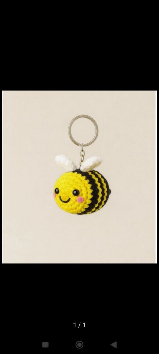 Renkli, sarı ve siyah örgü arı figürlü anahtarlık. Beyaz kanatlı ve gülen yüzlü, anahtarlarınıza sıcak ve eğlenceli bir dokunuş katıyor.