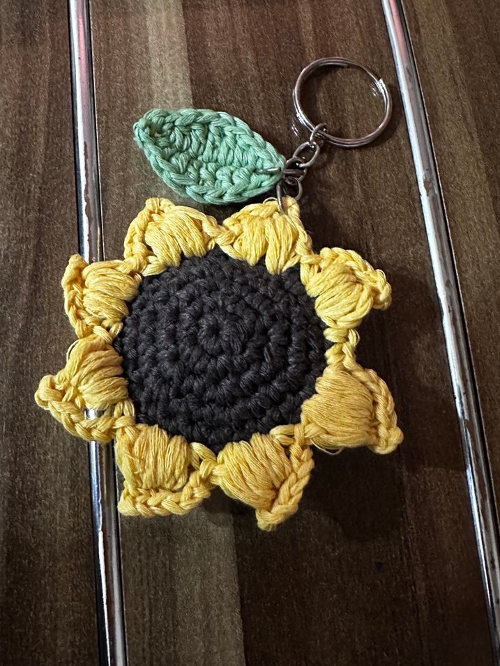 Renkli sarı ve kahverengi örgü ayçiçeği anahtarlık, yeşil yaprak detaylı. Rahat ve bohem tarz için uygun.