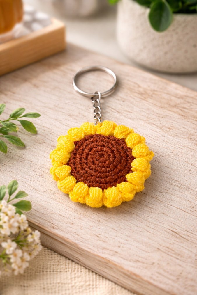 Renkli, örgü ayçiçeği desenli sarı ve kahverengi anahtarlık, bohem tarzına uygun ve sıcak bir his verir.